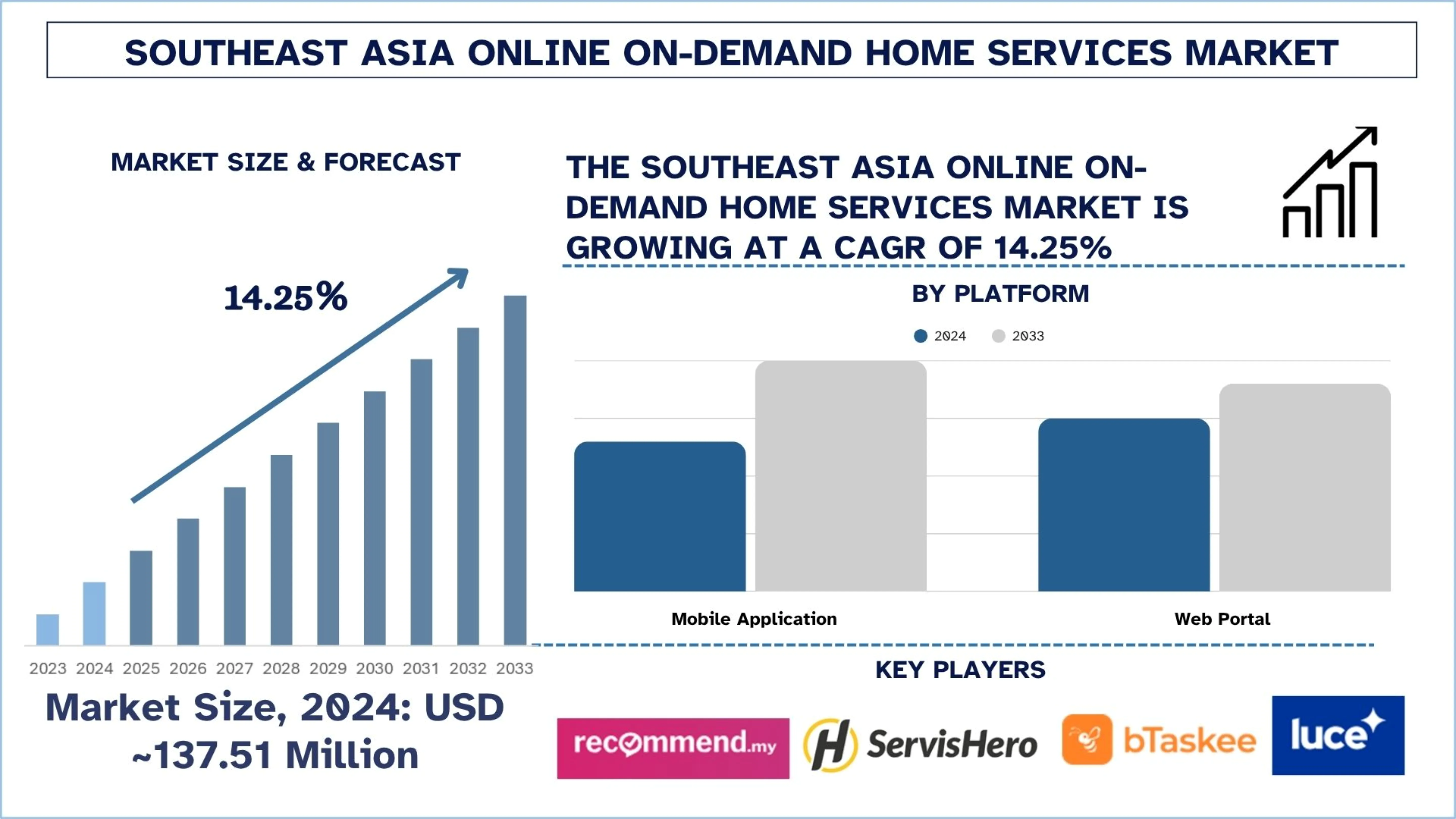 The Southeast Asia Online On-Demand Home Services Market was valued at ~USD 137.51 million in 2024 and is expected to grow at a strong CAGR of approximately 14.25% during the forecast period (2025-2033F),