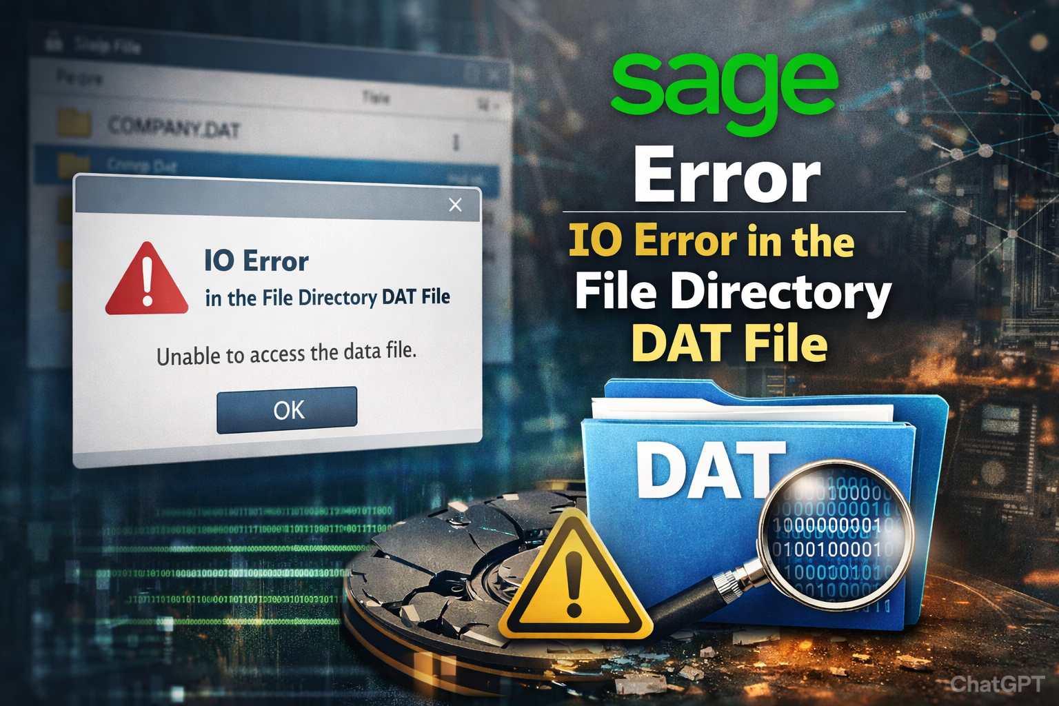 Sage Error IO Error in the File Directory DAT File is a critical issue that occurs when Sage software is unable to read, write, or access the company data file stored in the DAT directory. Since the DAT file contains essential financial records, transactions, and configuration data, this error can prevent users from opening their company file or completing accounting tasks. If ignored, it may lead to workflow disruptions and potential data loss.